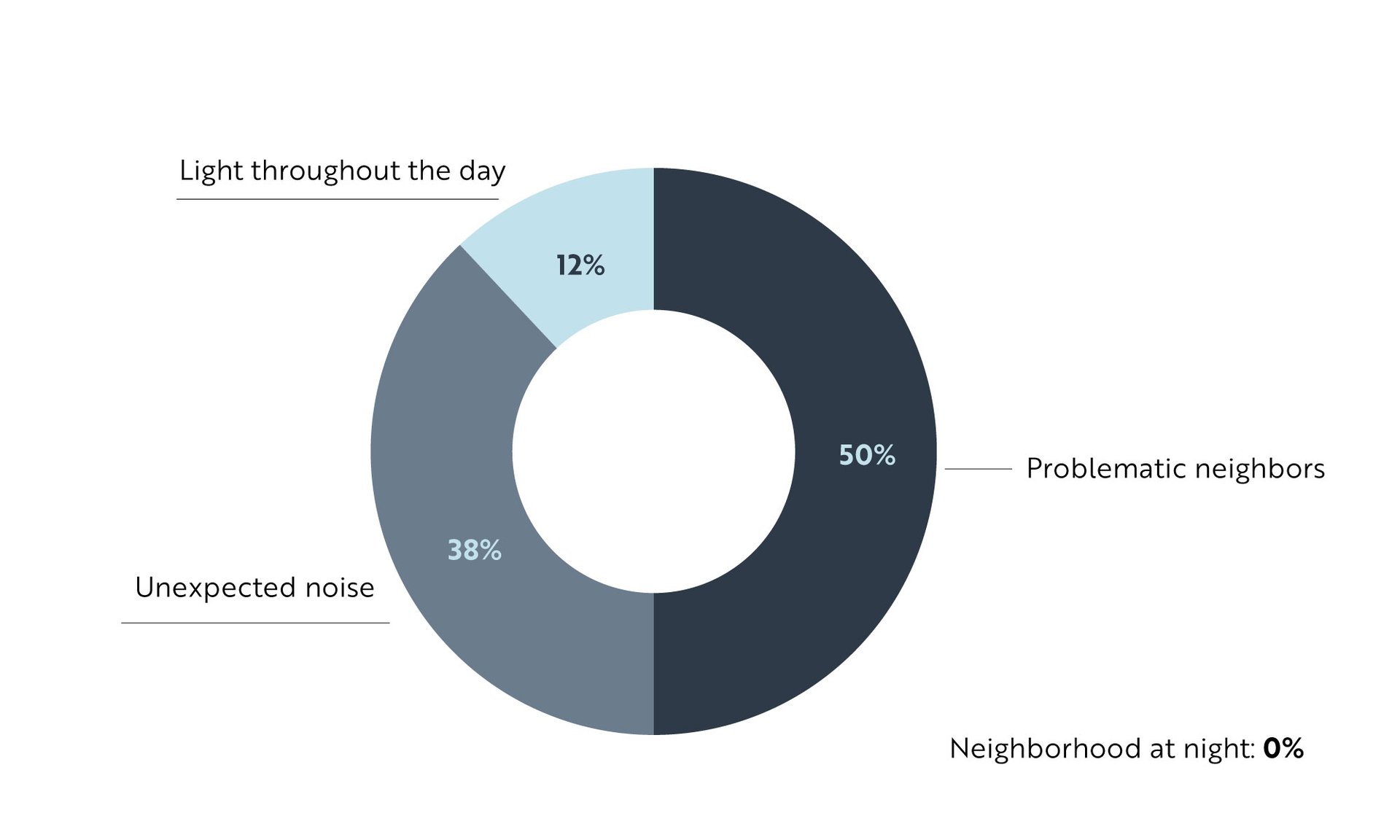 Problematic neighbors (50%) and unexpected noise (38%) dominate the responses, while factors like natural light and neighborhood feel rank far behind.