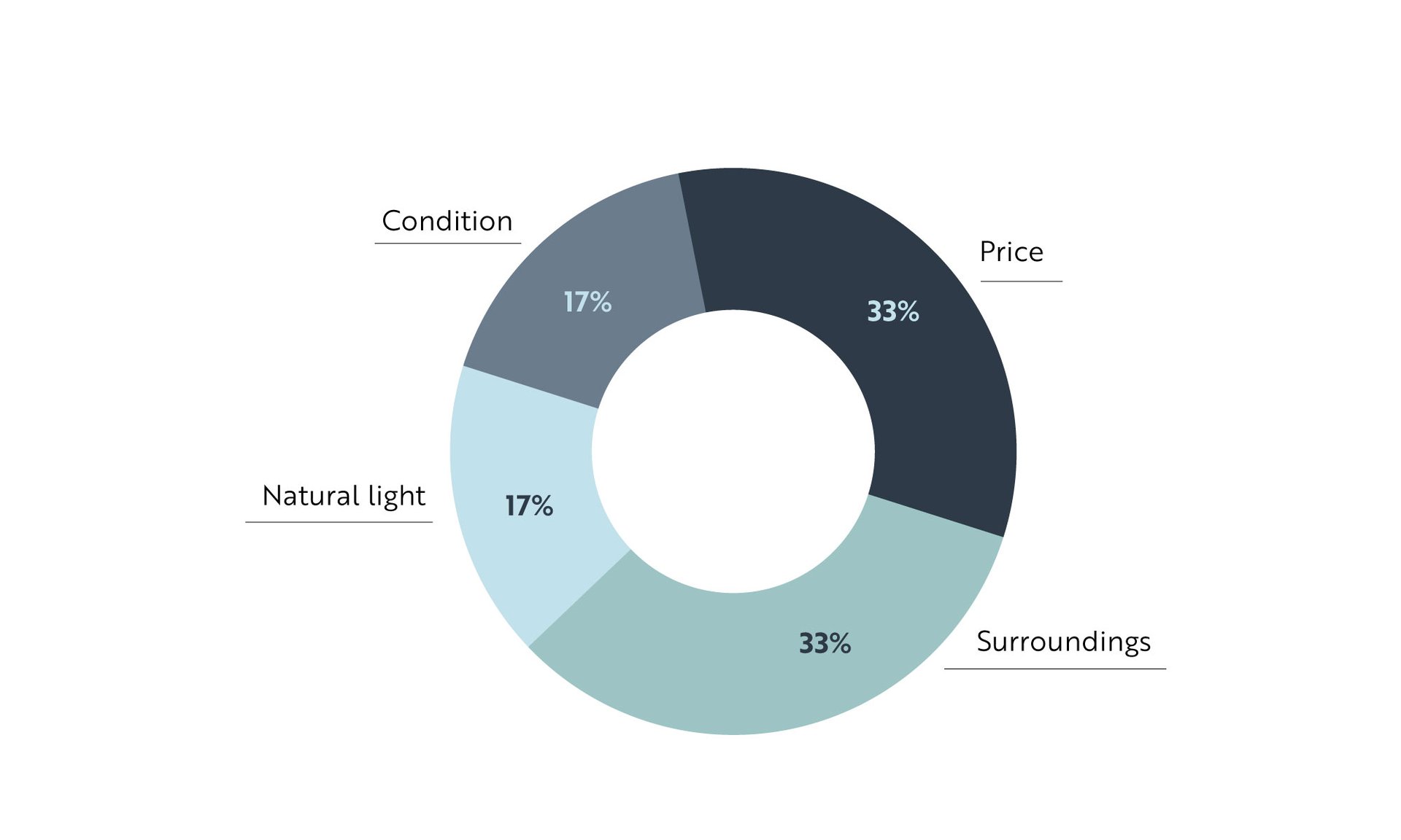 Two of the top responses, price and surroundings, exist outside the property. Price frames how buyers interpret everything they see inside, and surroundings shape how they imagine living there.