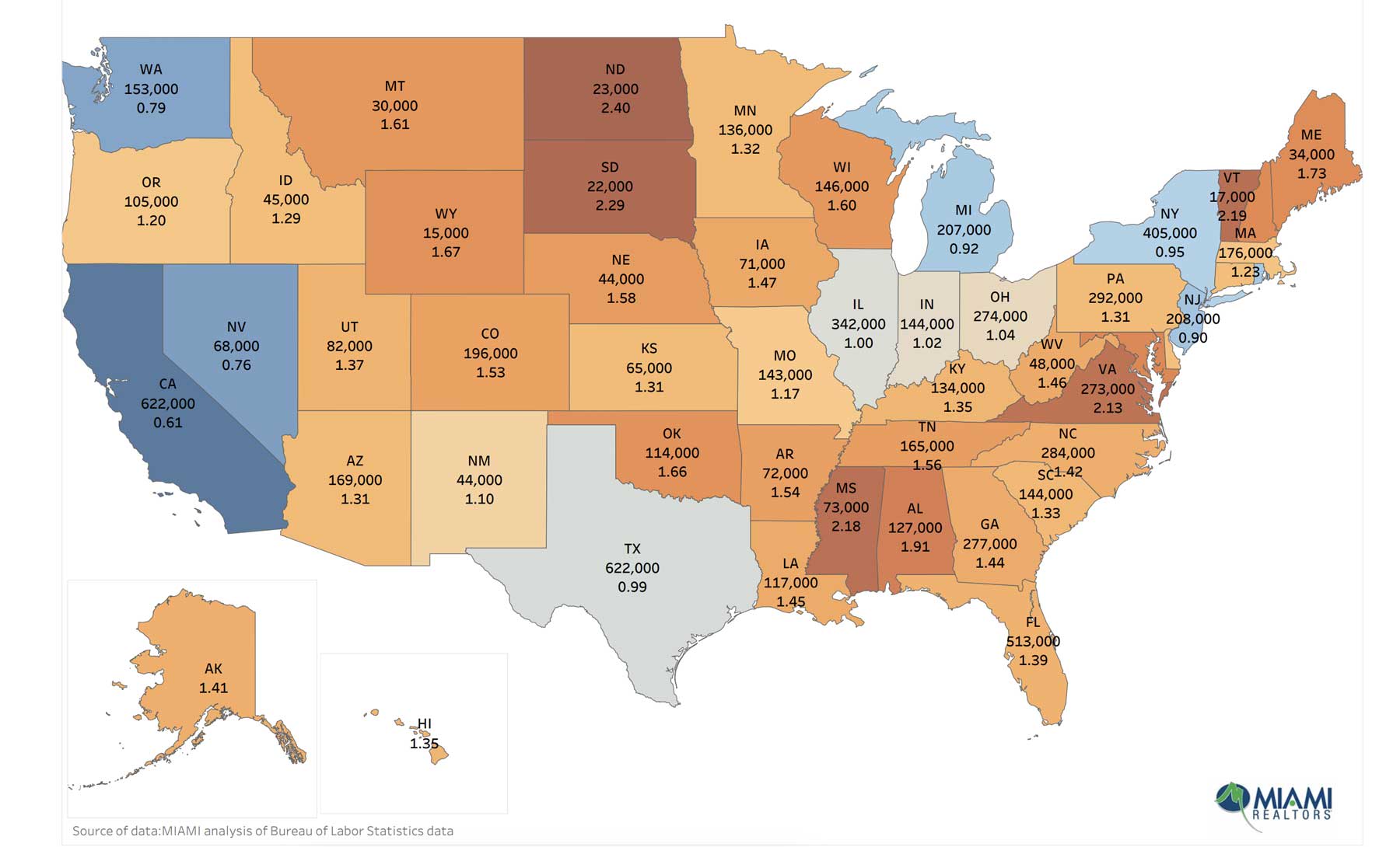 The Bureau of Labor Statistics released state-level data on August employment and July job openings. The data shows that Florida tops all states with the largest number of job openings where there are more job openings than job seekers.By number, Texas (622,000), California (622,000), Florida (513,000), and New York (405,000) have the most job openings. However, only Florida has more job openings than job seekers (144,554 more openings than unemployed or 1.4 openings/job seeker).