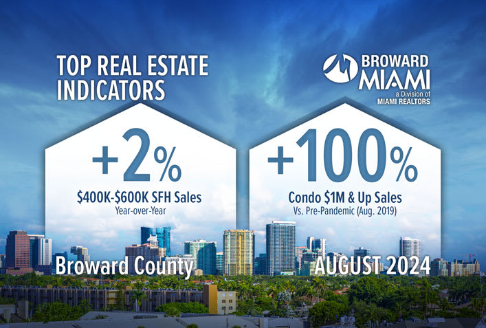 MIAMI — Broward County $1M & up condominium sales increased in August 2024 versus pre-pandemic numbers, according to statistics released by the MIAMI Association of Realtors (MIAMI) and the MIAMI Southeast Florida Multiple Listing Service (SEFMLS).