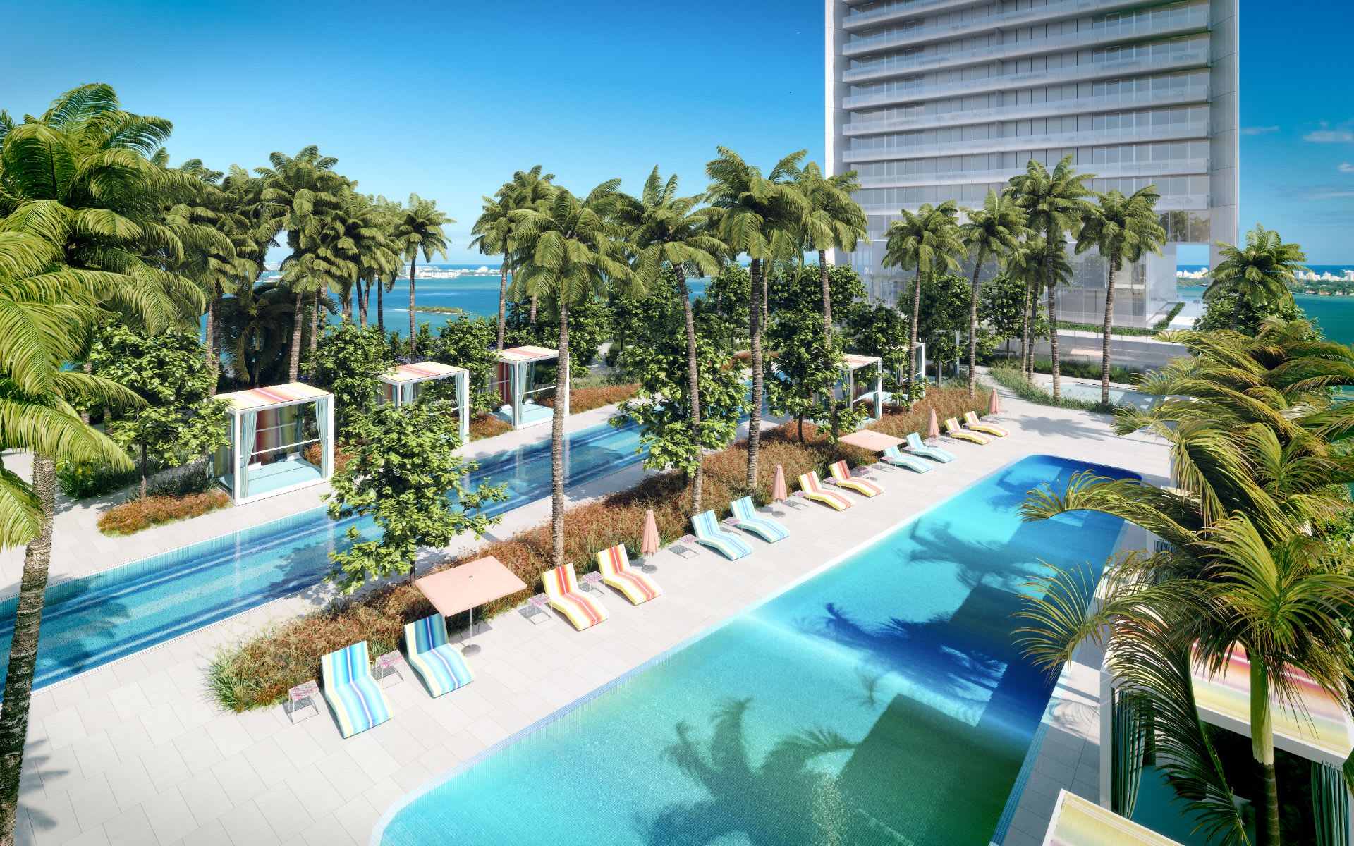 Boasting a stunning 200-foot facade on Biscayne Bay in East Edgewater, Missoni Baia is a unique work of high-performance architecture. Designed by internationally acclaimed Hani Rashid of Asymptote Architecture and developed by OKO Group, Europe's most successful development firm, this visionary architectural landmark is influenced by minimalist art and driven by pioneering engineers. Missoni Baia offers a residential experience of unparalleled quality, with the distinctive Missoni aesthetic, one of the most legendary fashion houses in the world, with the same pioneering style of technical innovation and design excellence. New York designer Paris Forino envisioned the 249 unique residences with a choice of one to five bedrooms. The building offers expansive recreational areas unparalleled in Miami—four swimming pools, including an Olympic-sized pool, tennis court and one of the largest and most elegant spas in South Florida, adorned with landscaping by Enzo Enea. Missoni Baia sets a new standard of quality and sophistication in East Edgewater.